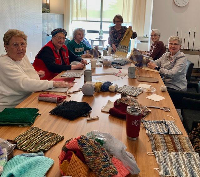 Club members joining knitted squares to make lap robes for veterans’ homes.